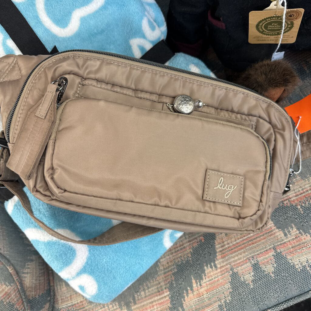 Tan nylon belt bag by lug with two top zipper pockets and one back zipper pocket.