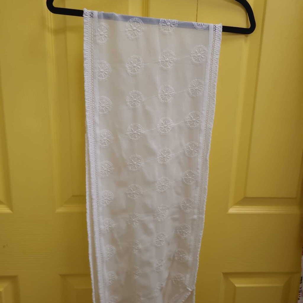 Pointed ends , semi sheer with very short tassels along the entire edge , embroidered circles