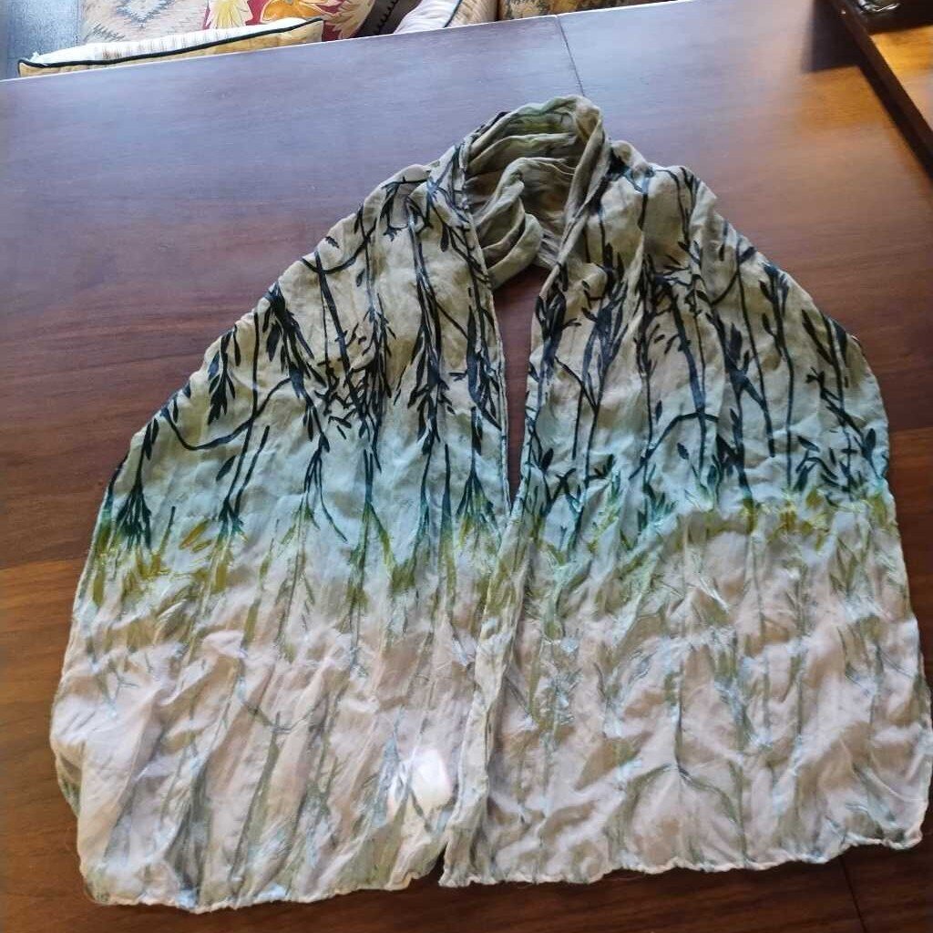 Narrow ombre silk neck scarf with burn out stems and leaves.