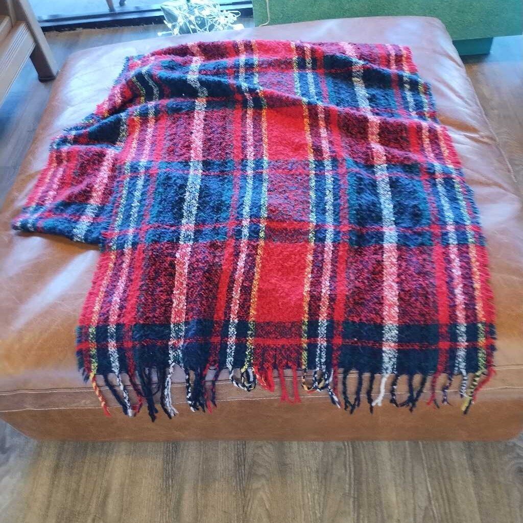 Plaid printed large fuzzy scarf with fringe ends.