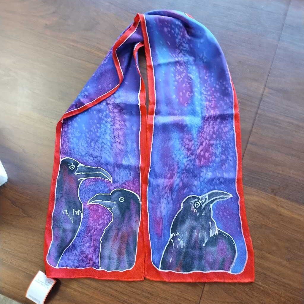 Narrow purple tie dye silk neck scarf with raven bird ends.