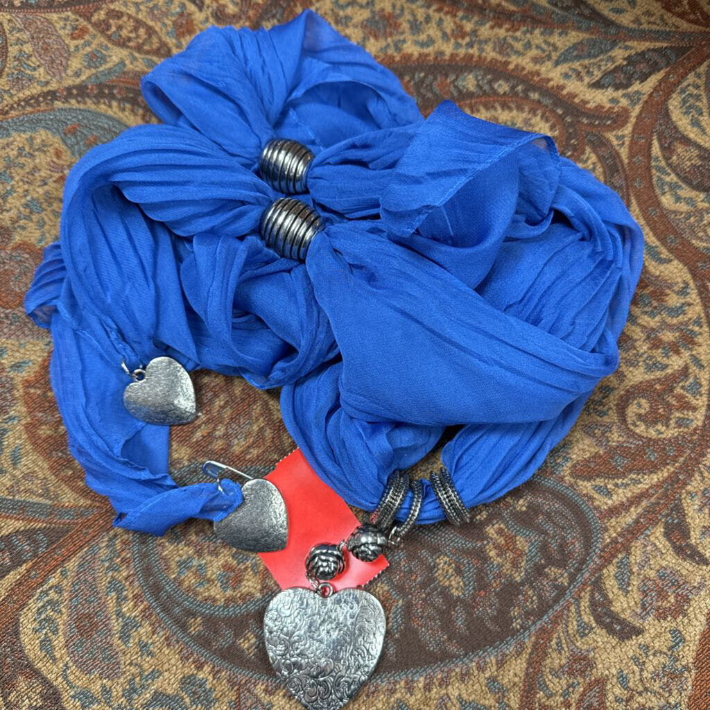 Blue pleated and sheer neck scarf necklace with heart themed silver toned accents.