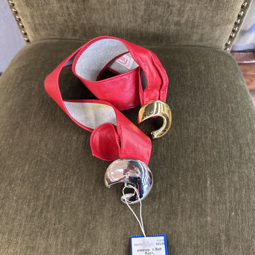 Silver and gold tone clasp buckle with red leather 2" wide belt.