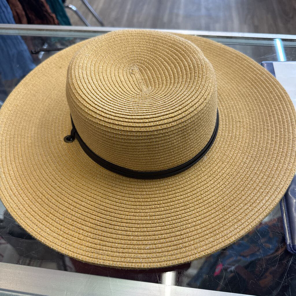 Straw sun hat with wide brim and neck ties.