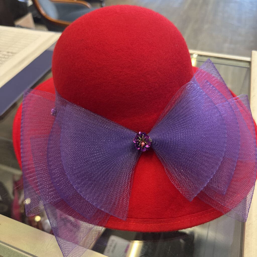 Red wool hat with purple ribbon which ties in a bow, and bling in center. Great condition.