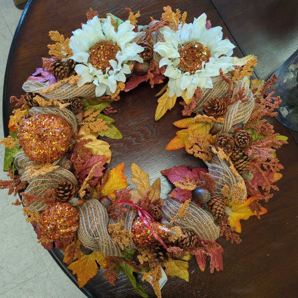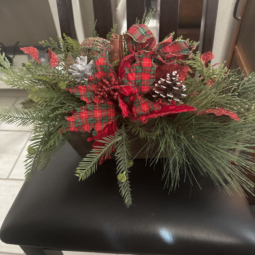 Evergreen plaid ribbon centerpiece 9” x 11” Green multi