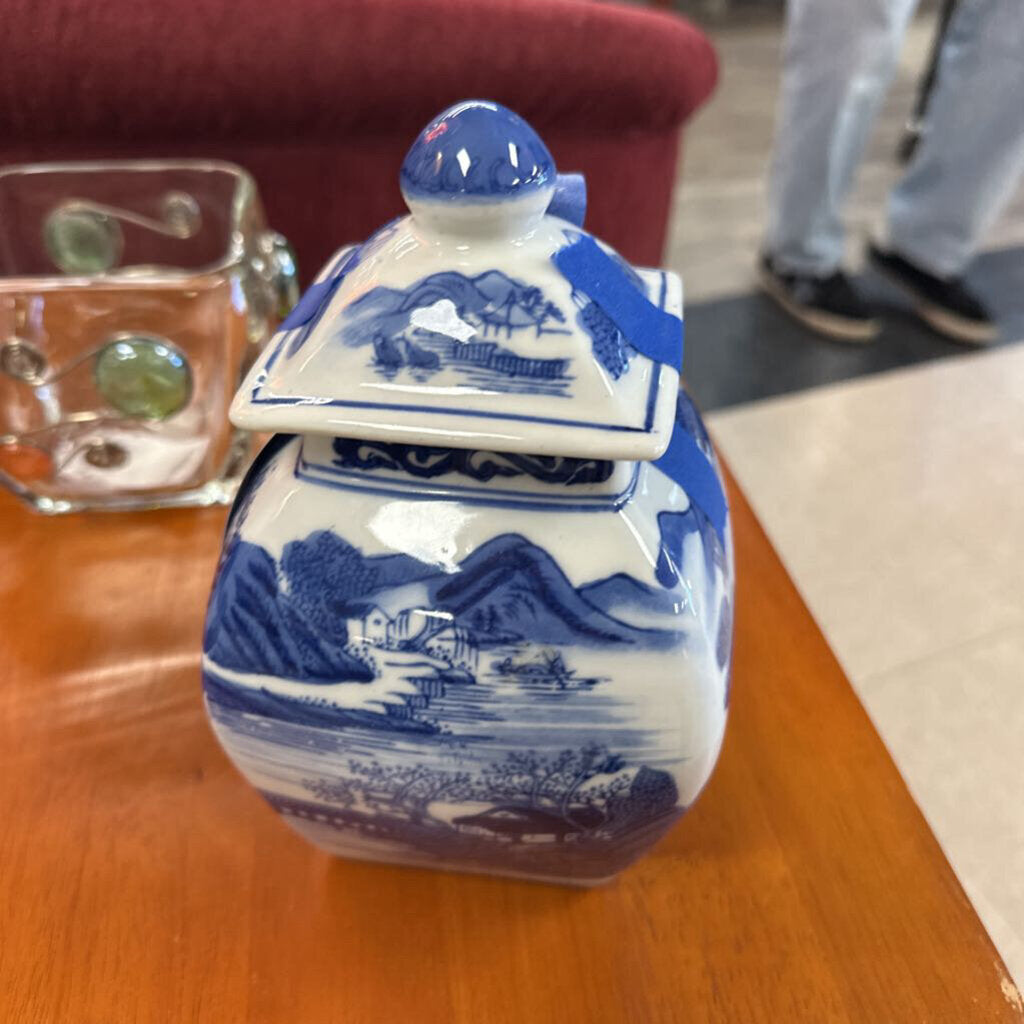made in china Vintage Jar w/Lid 8"T x 4.5"W Blue/white