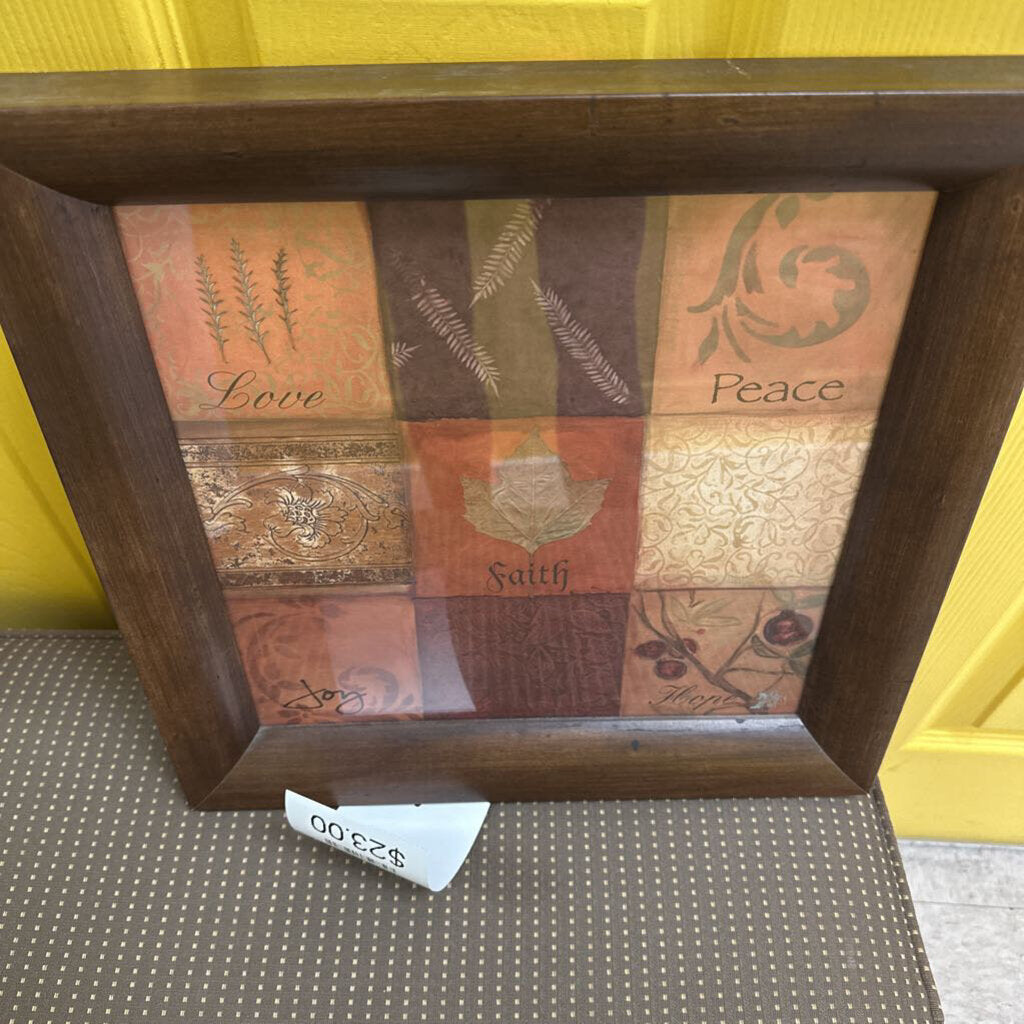Brown wooden framed patchwork picture with "Peace, Love, and Faith" words.
