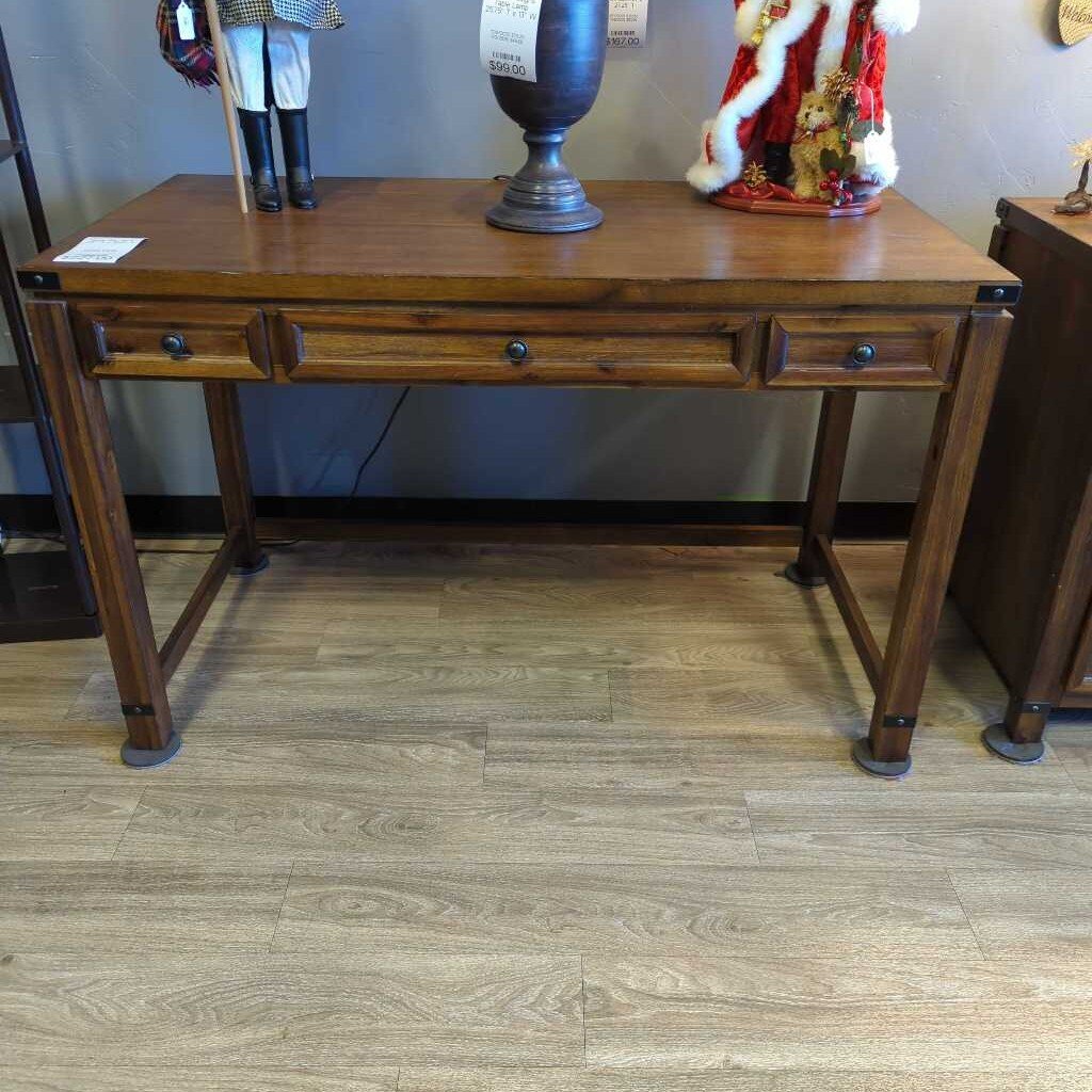 Flat surface desk with 3 drawers. 2 are small and one is lager.