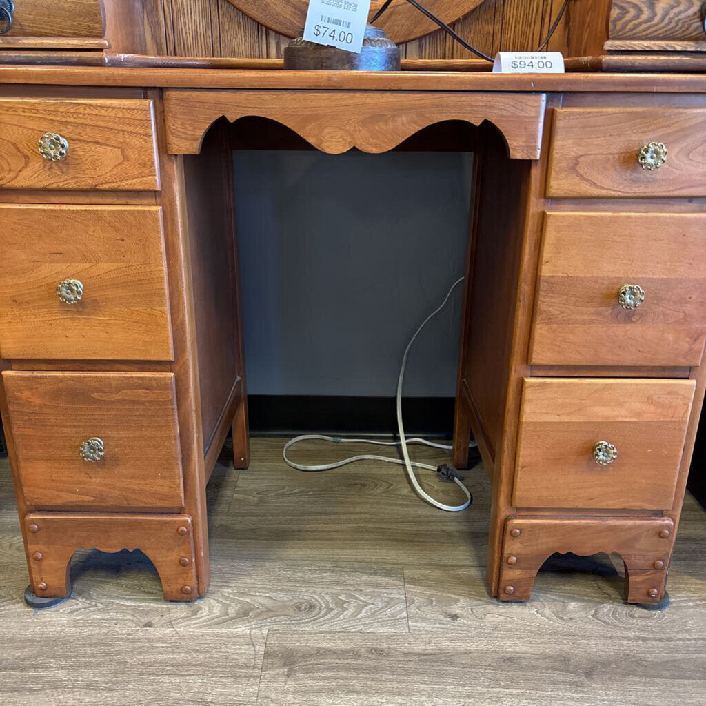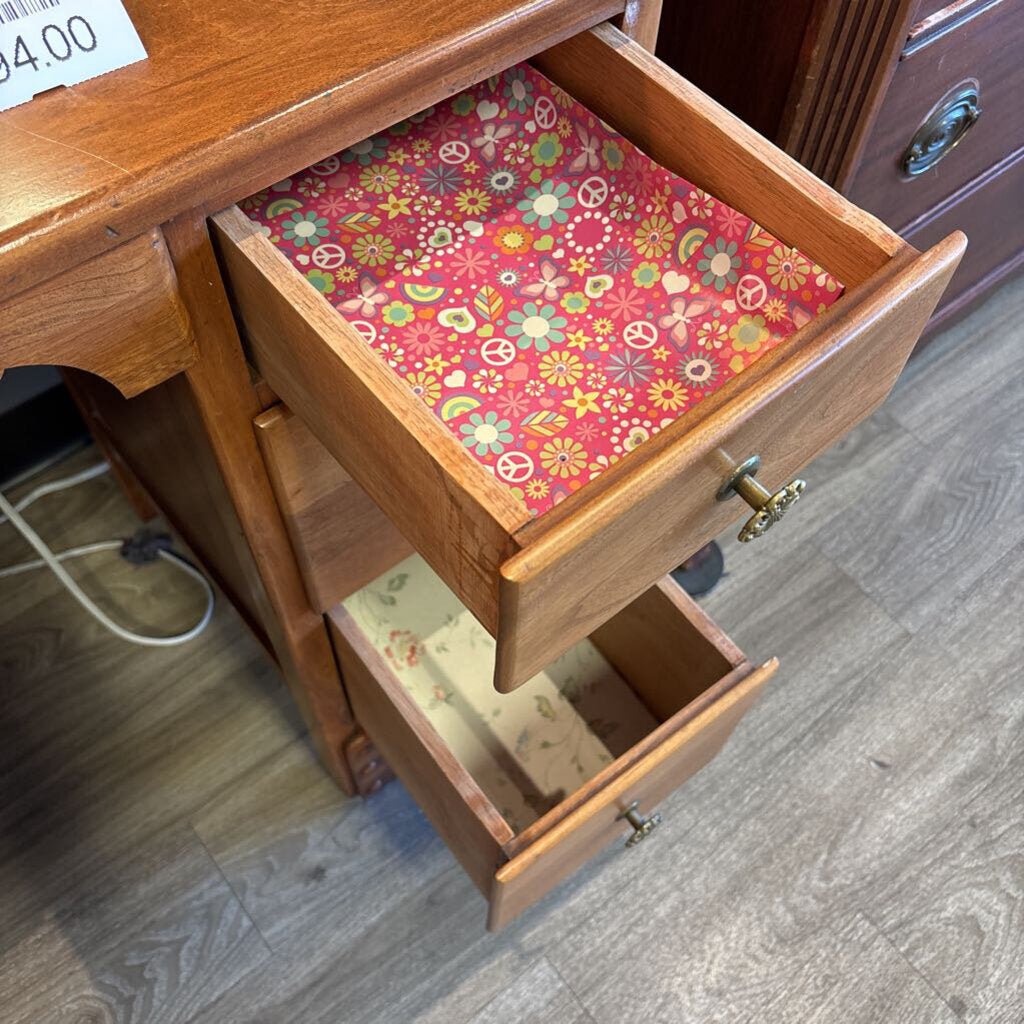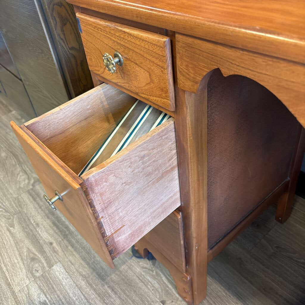 vintage solid wood; 6 drawers with metal pulls (3 on either side; center left open; could be student desk or vanity - OR BOTH