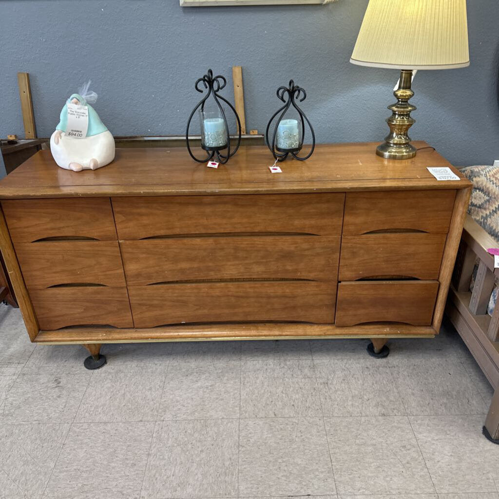 Dresser base pressboard with wood laminent on top, drawers solid wood, gold metal coloredtrim on bottom, 3 big drawers down middle, 3 small drawers on either side, mirror 36'x42', surface very scratched