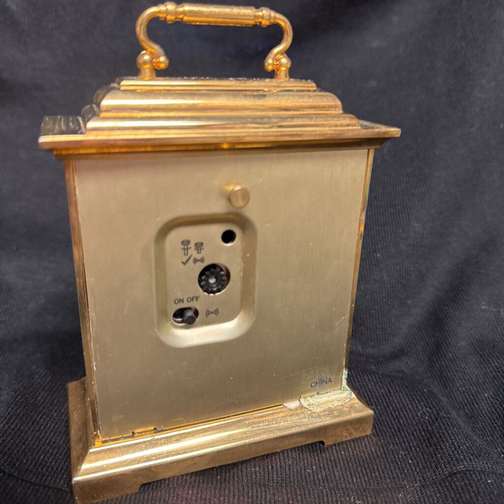 small table top carriage style clock; quartz movement; battery operated; has alarm