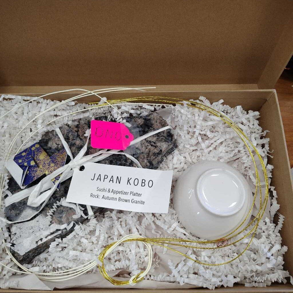 Sushi and appetizer platter and cup, the platter is a autumn brown granite rock. In a gift box.