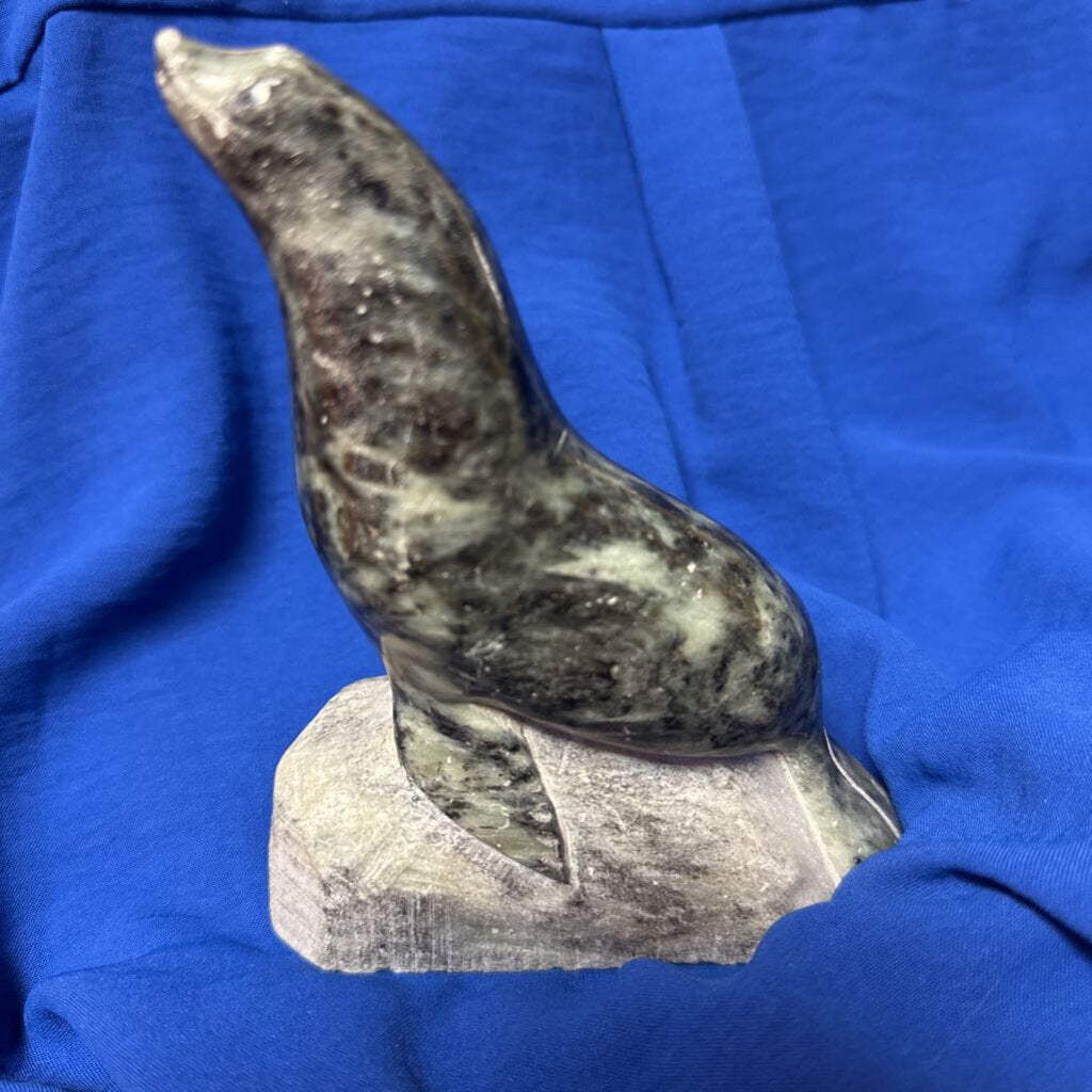 carved stone sea lion; artist etched name "Anton"; black and gray blended colors