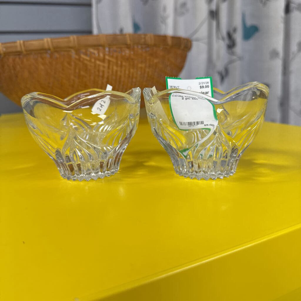 each glass candle holder is 3" dia and 2 inches high; hold tapered candle or small tea light