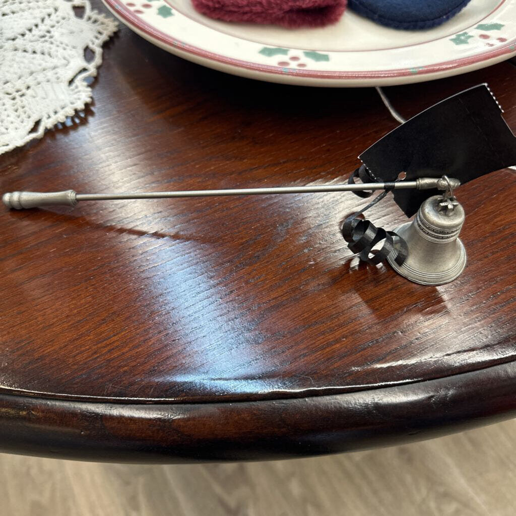 Silver tone 9' metal candle snuffer with Liberty Bell motiff.