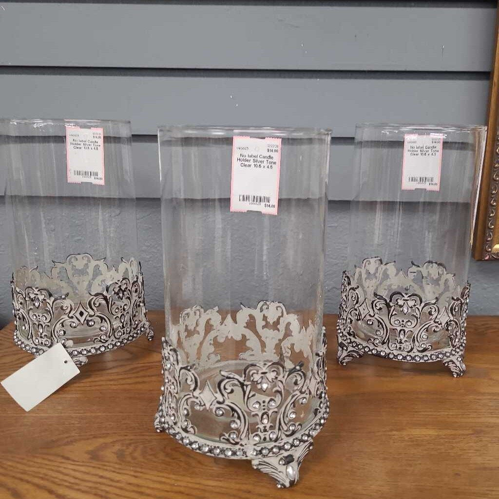 Large silver tone base glass candle holder.