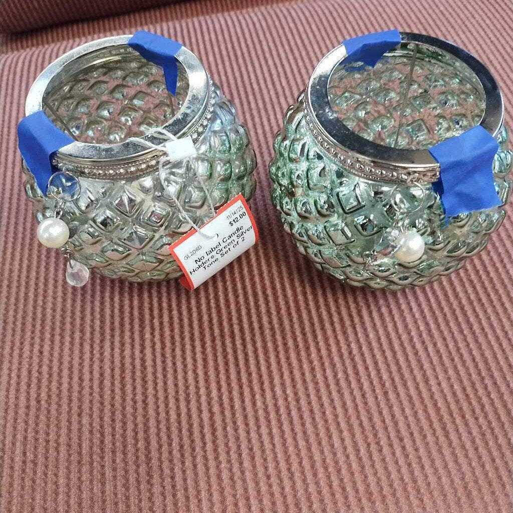 Set of two votive candle holders with silver tone rims and pearl charm accents.