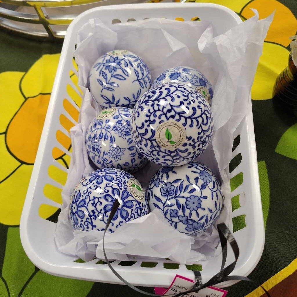 Set of 6 decorative balls-white porcelain with blue vine/floral pattern
