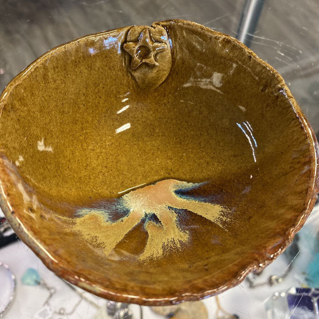 Brown glazed ceramic decorative bowl with star symbol at inside rim.