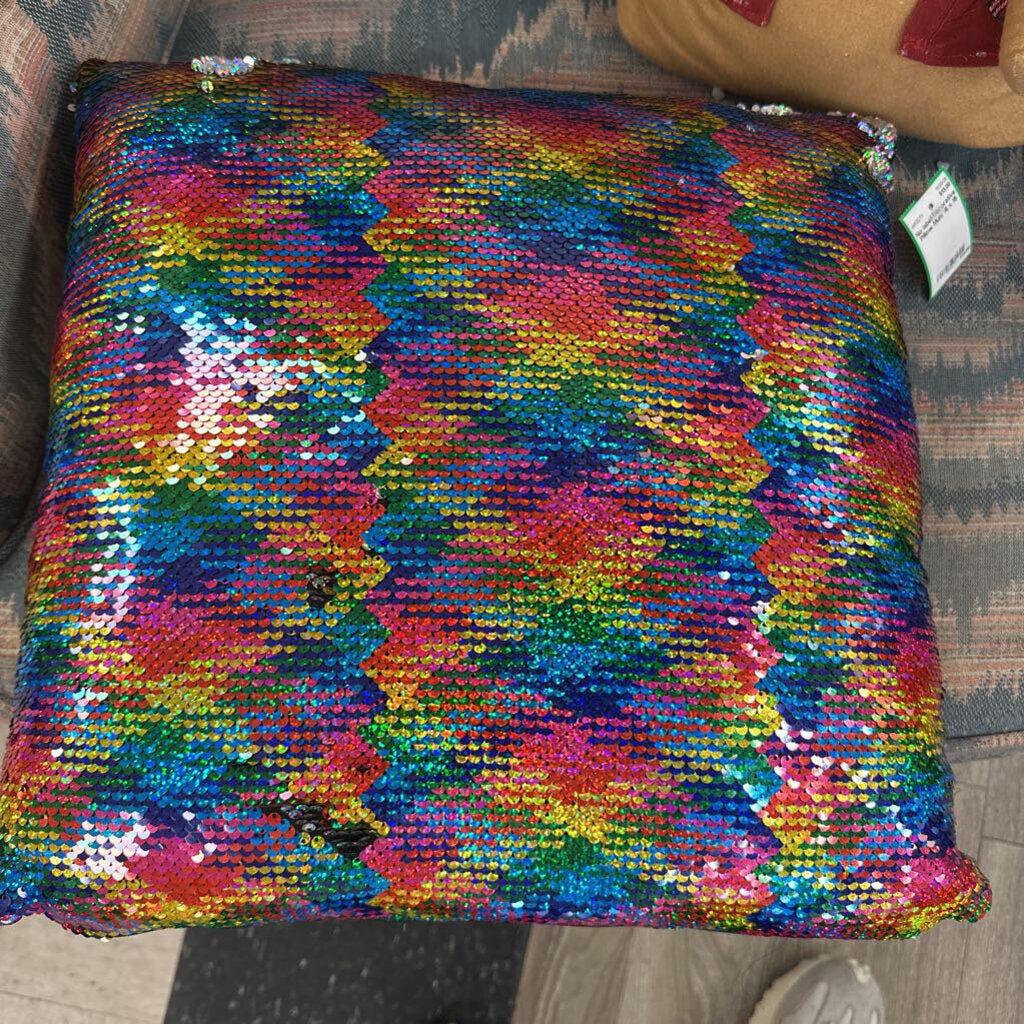 Multi colored sequin front decorative square pillow with black solid back.