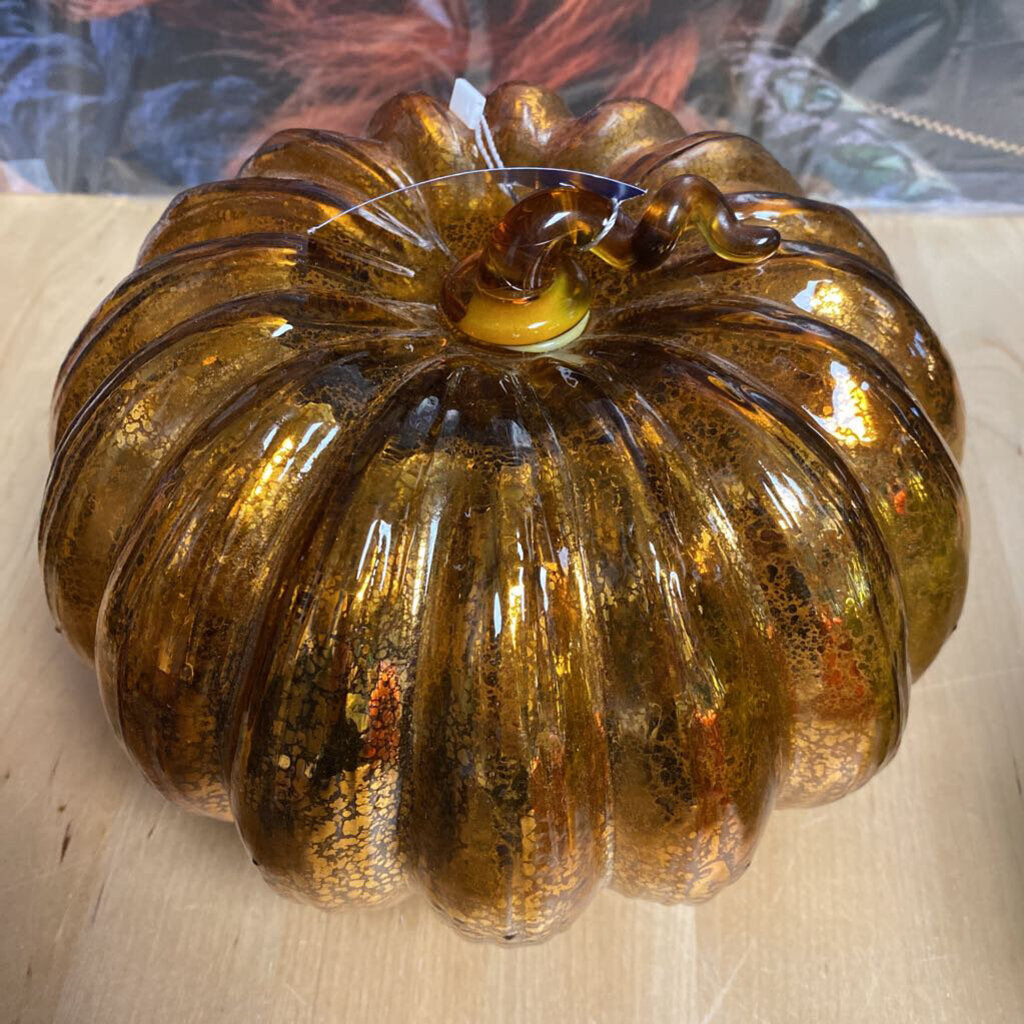 Gold crackled glass pumpkin with hole at bottom for candle.
