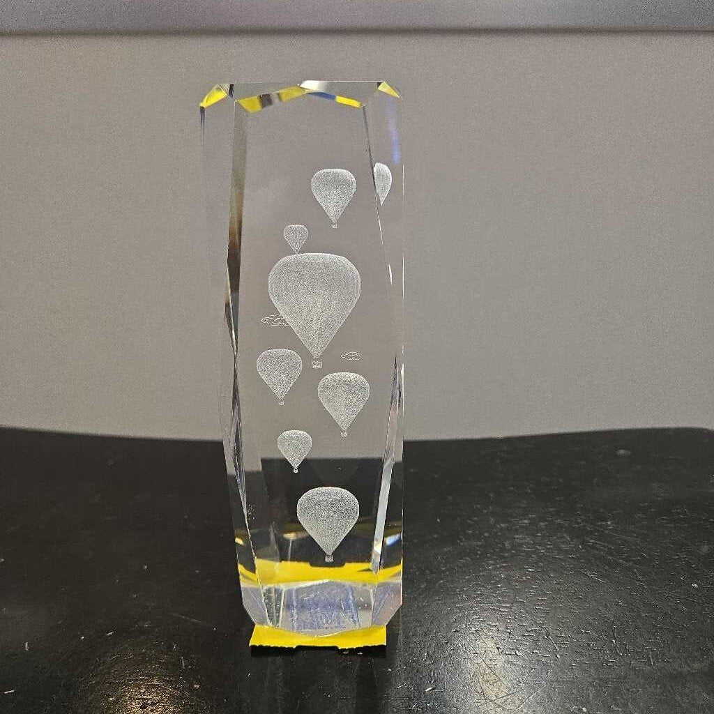 Crystal paperweight featuring internal 3D laser etchings of hot air balloons.