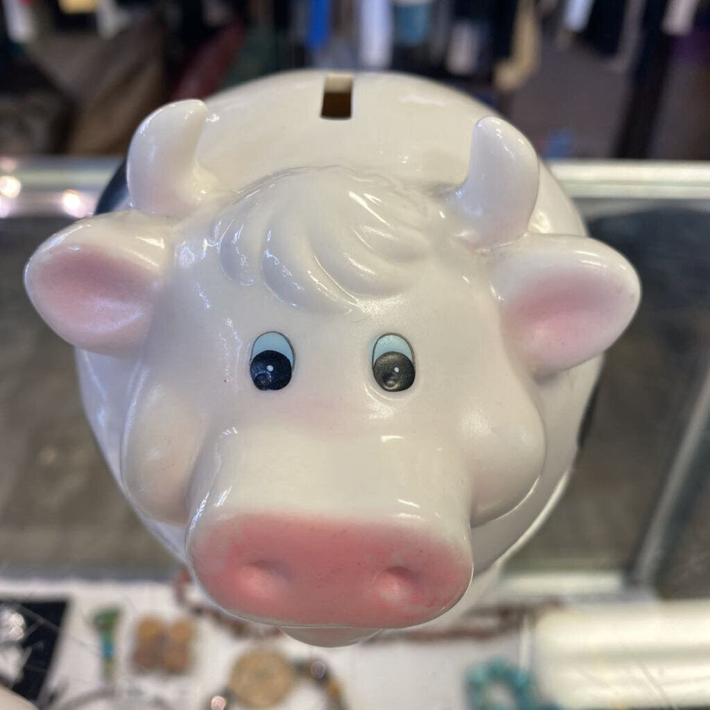 White and black pig shaped piggy bank with rubber stopper bottom.