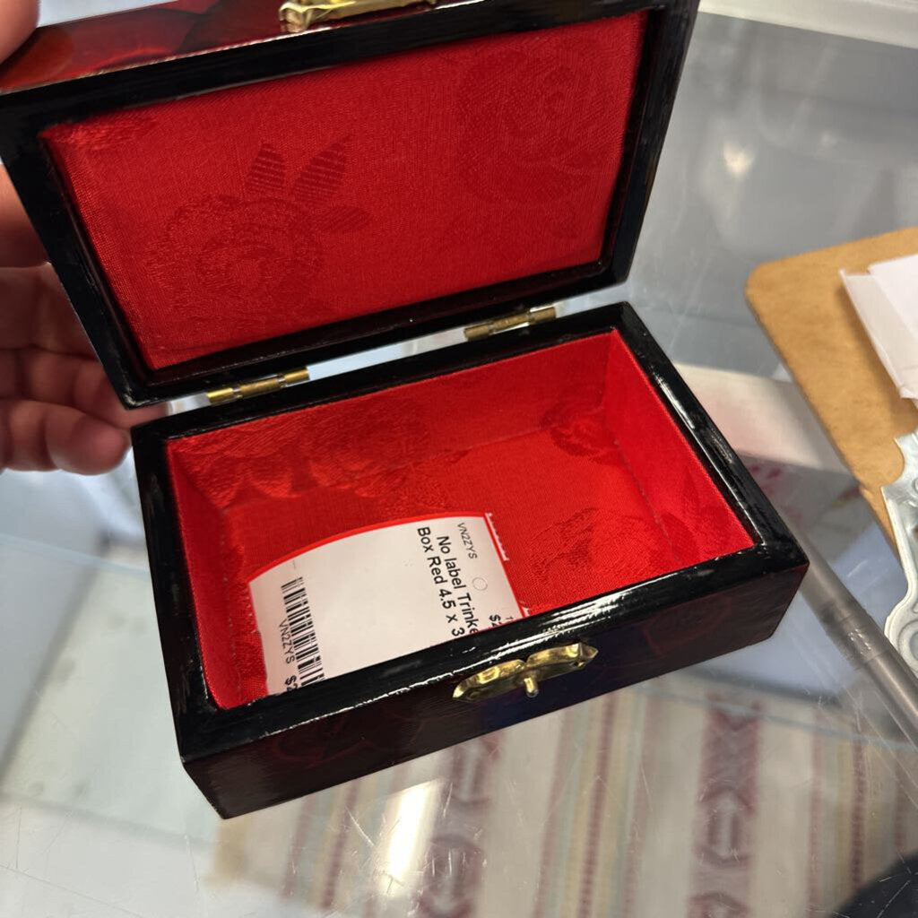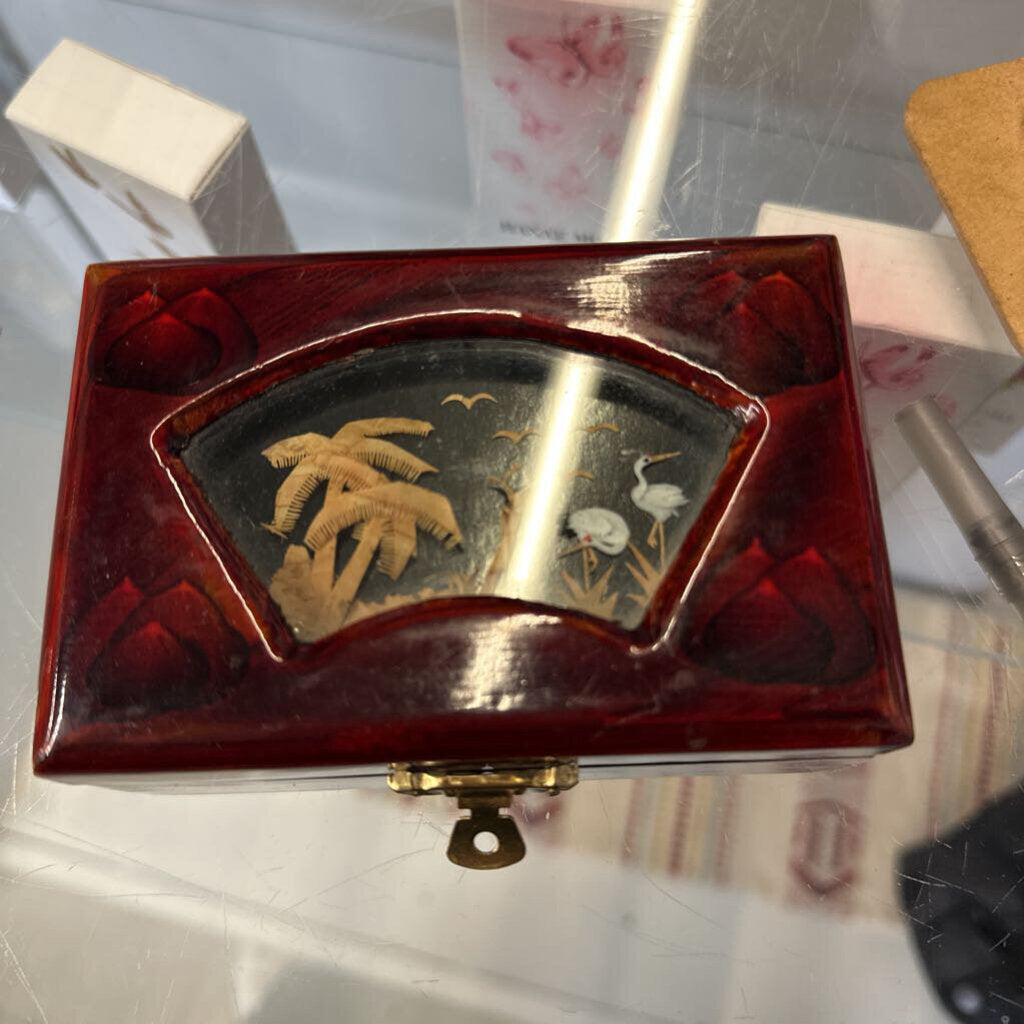 Vintage Chinese lacquered trinket box with palm trees and cranes.