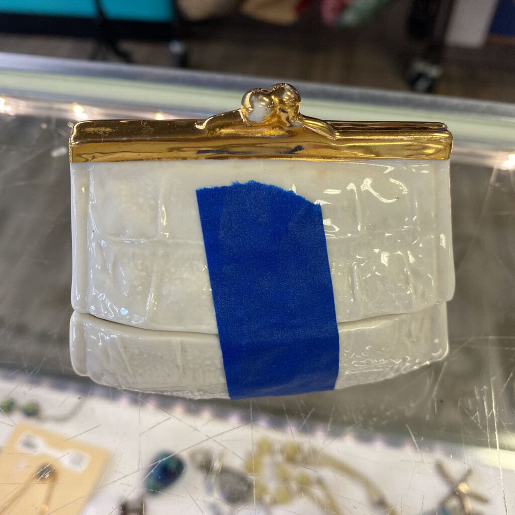 Ivory porcelain handbag trinket box with lid, made in Italy.