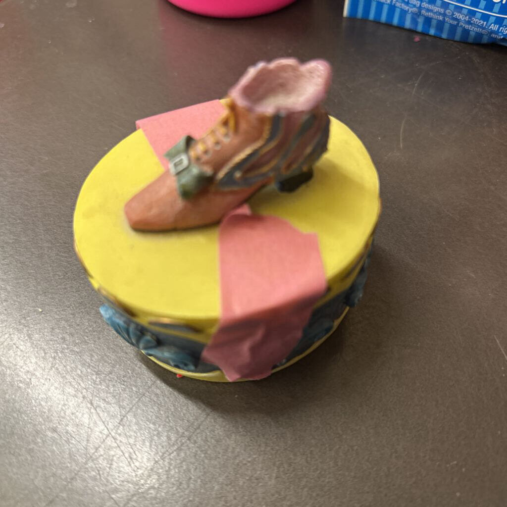 Small trinket box with lid that has a fancy shoe on it mostly in a yellow color, two piece set.