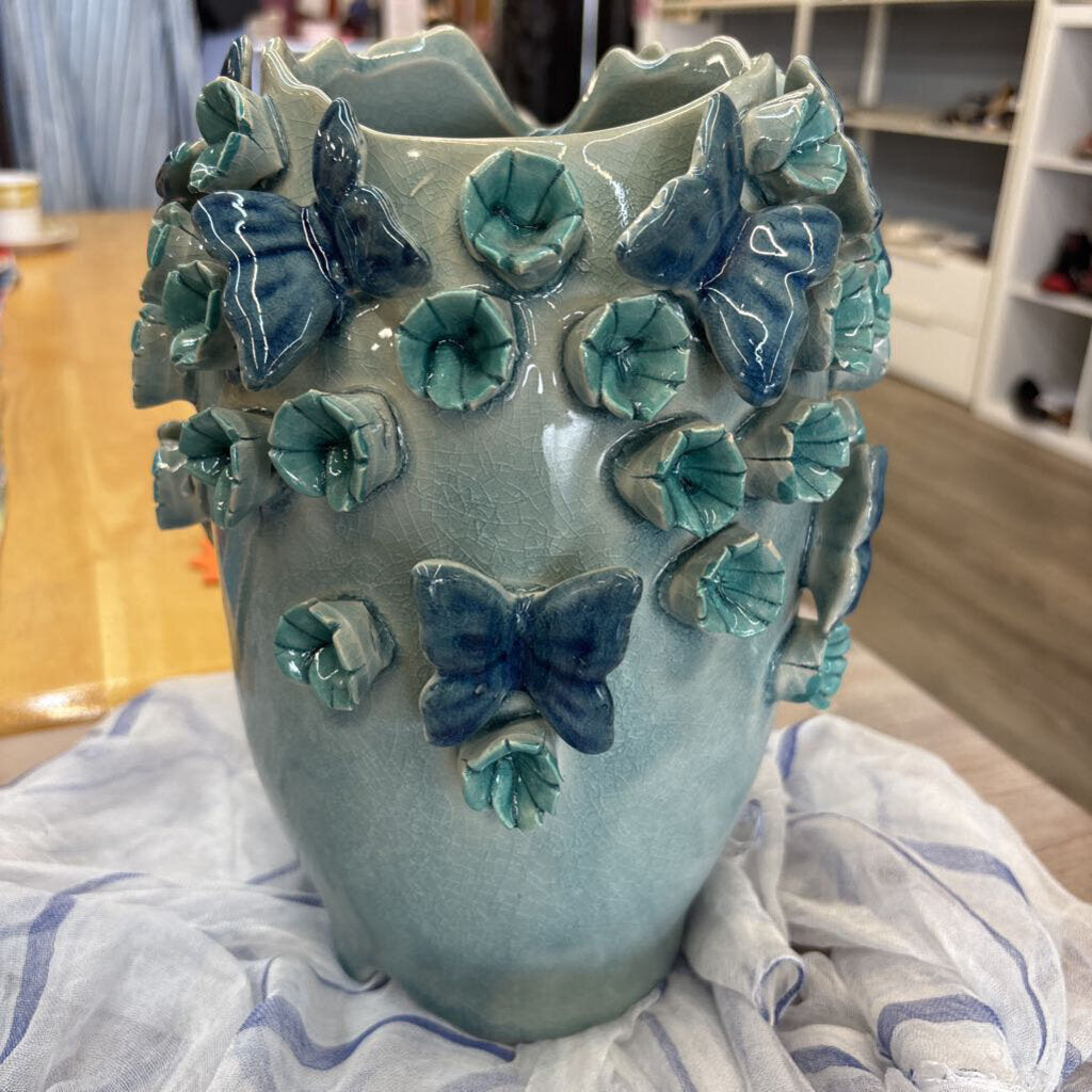 Pier 1 ceramic butterfly vase with 3D flowers and butterflies.