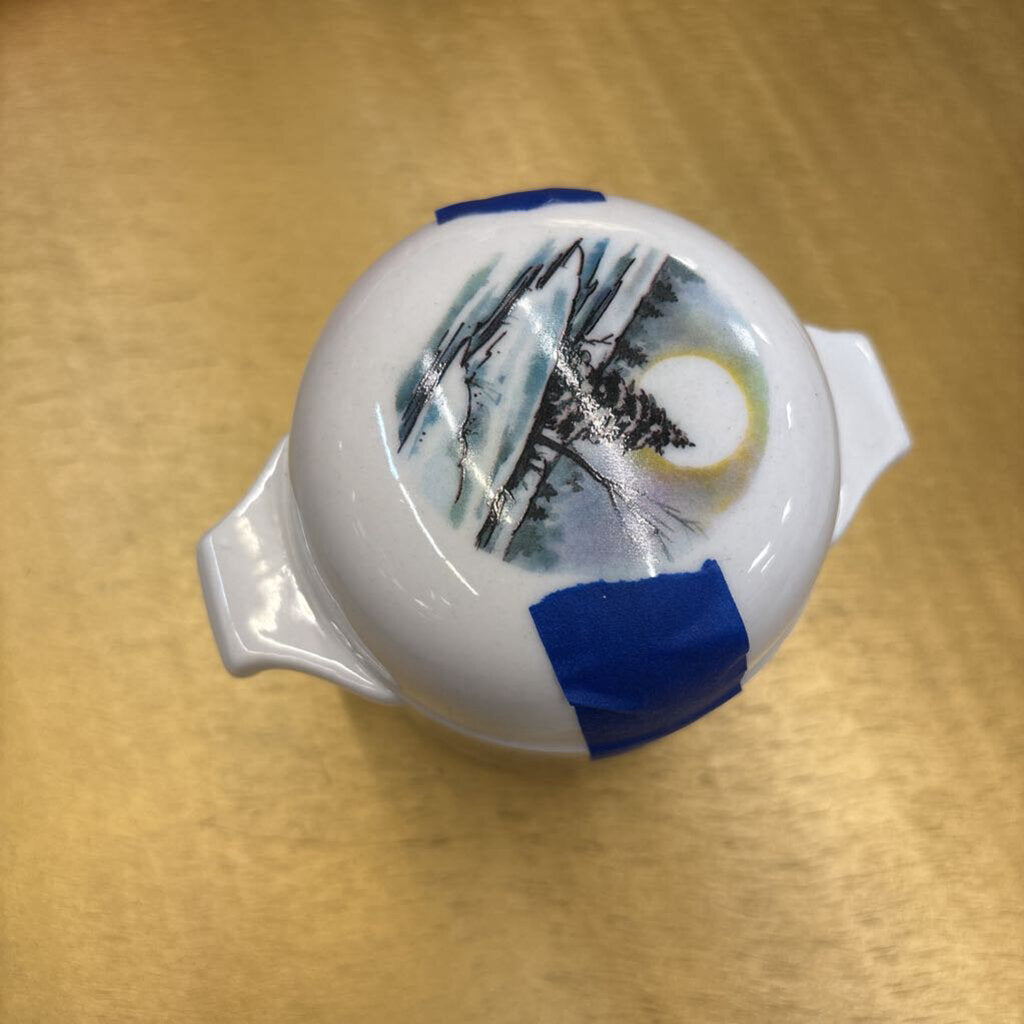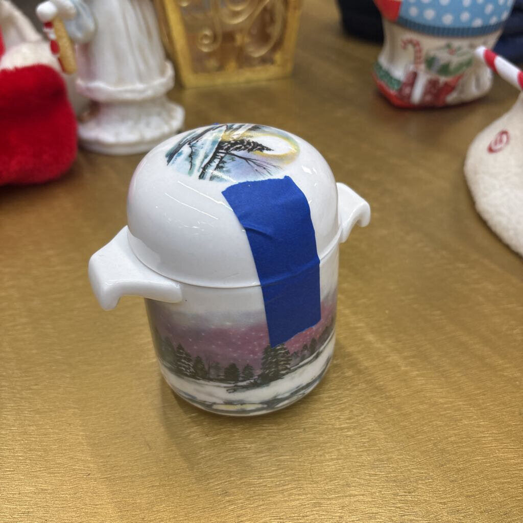Small bone China candle with lid, depicting a winter scene.
