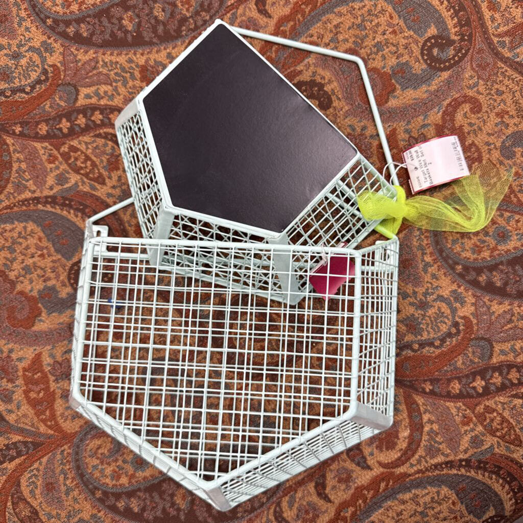 Set of 2 wire hanging baskets. Lg: 12" x11", Sm: 10" x 9". Small one has a chalkboard label on front.