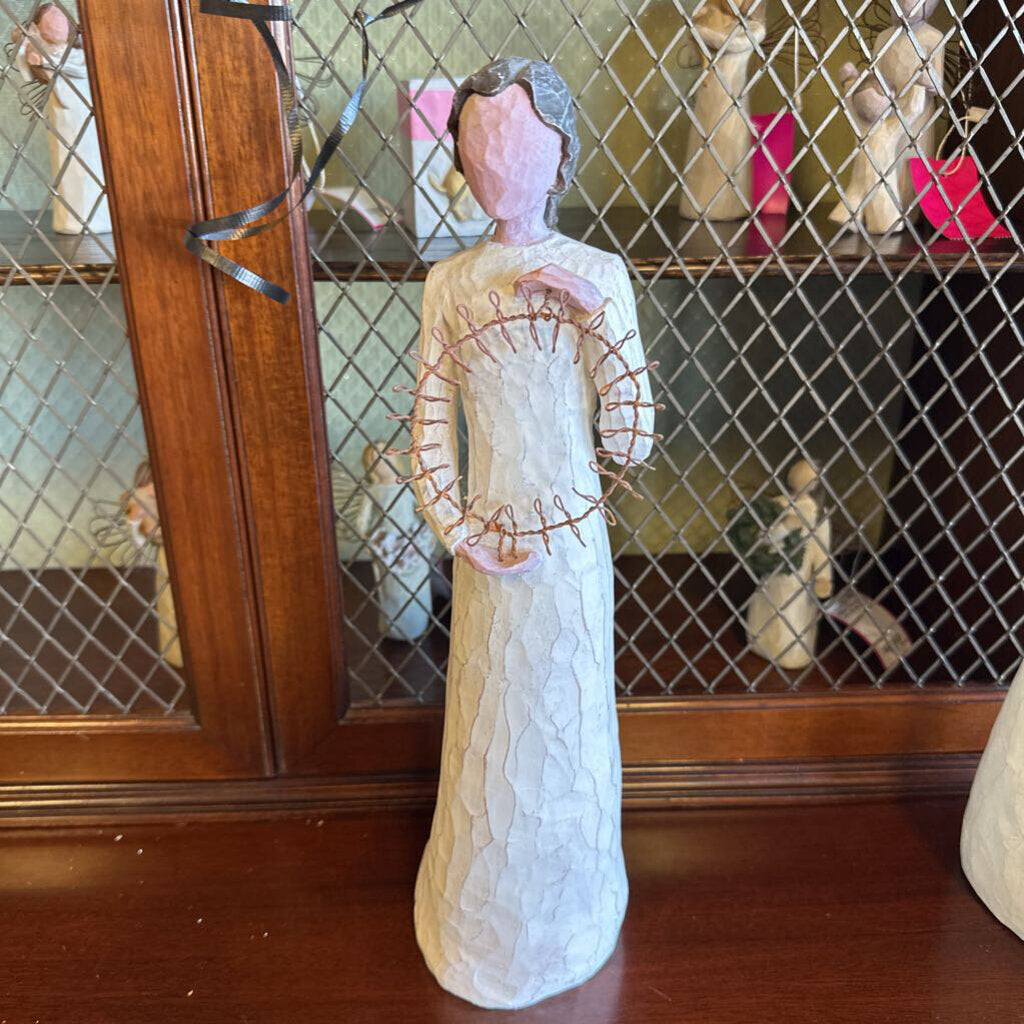Willow Tree "Welcoming Spirit" figurine featuring a tall woman holding a metal circle.