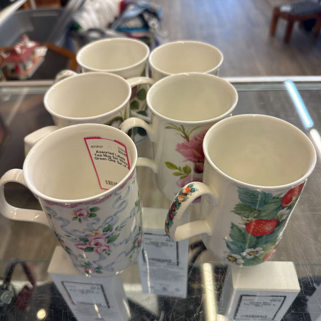 Set of 6 bone china tea mugs with floral and green leaf designs.