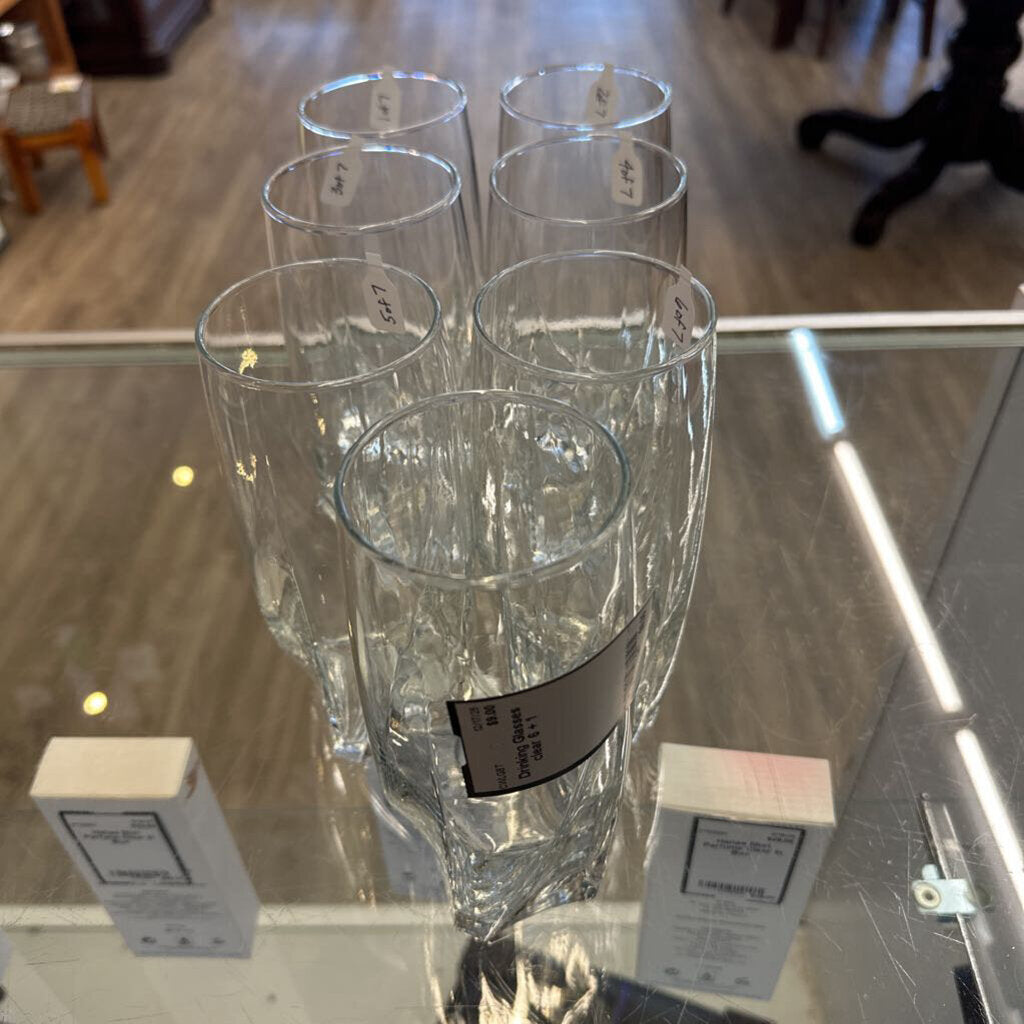 7 clear drinking glasses; slight twist accent; weighted bottom