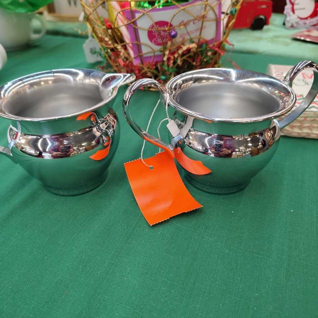 Silver tone sugar and creamer set with handles.