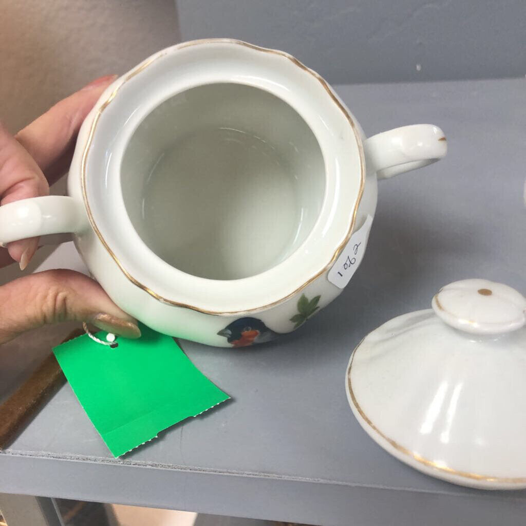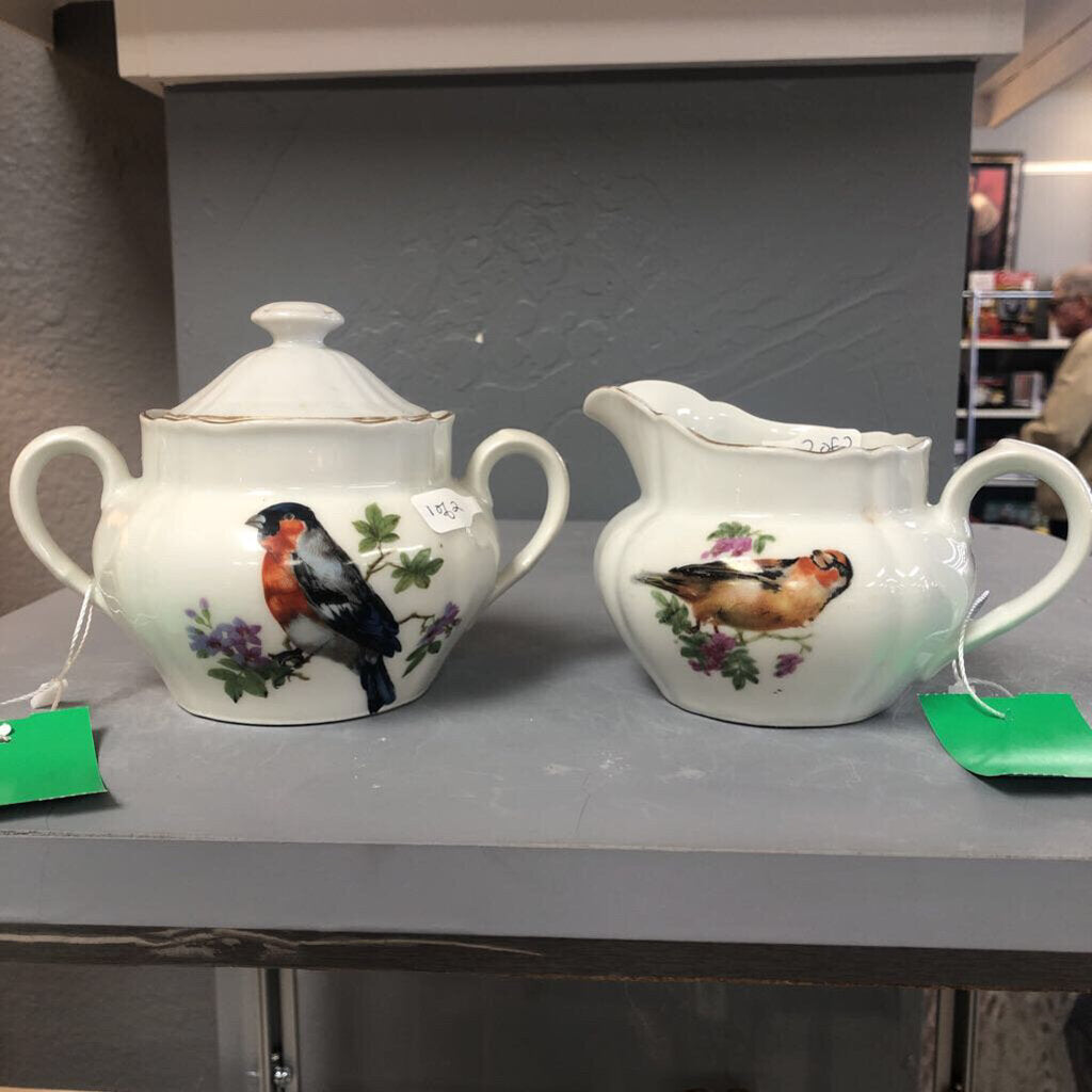 Vintage Cream & sugar set: Creamer size: 3.5" x 5.5" w/handle. Sugar bowl w/lid: 5"T x 6.5"W Both have colorful bird decoration on front. Great Find!