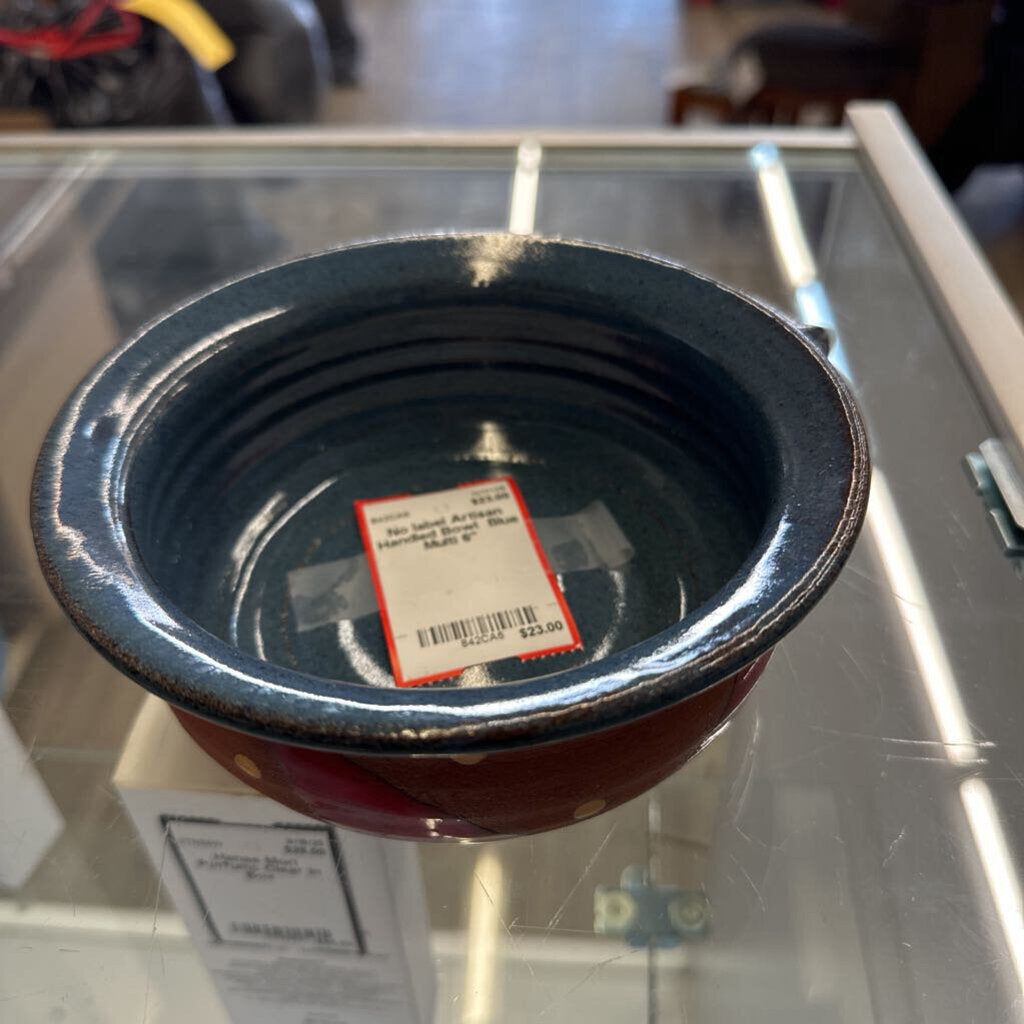 Earthenware, blue center with speckles , red peppers and yellow polka dots around the outer edge