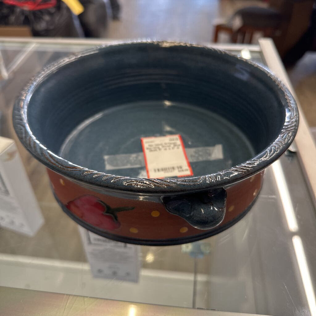 Earthenware, blue center with speckles , red peppers and yellow polka dots around the outer edge