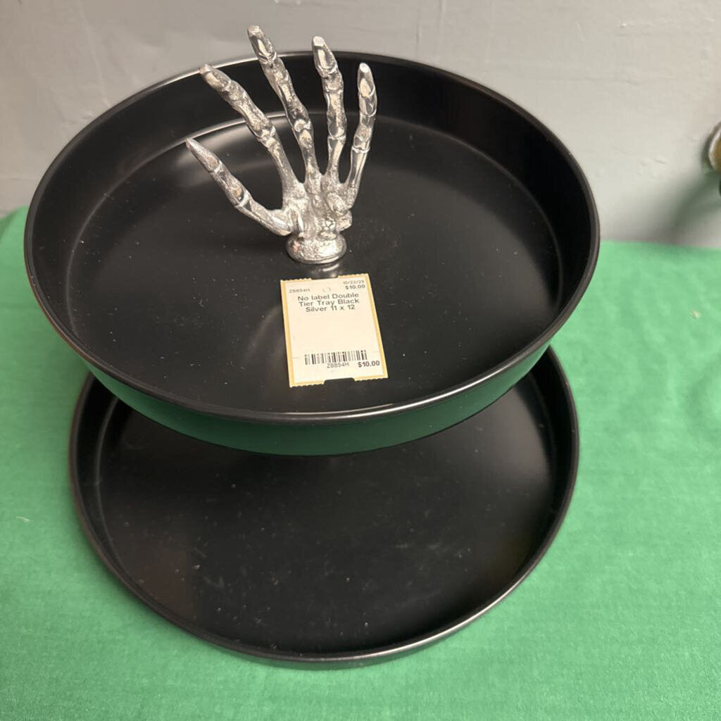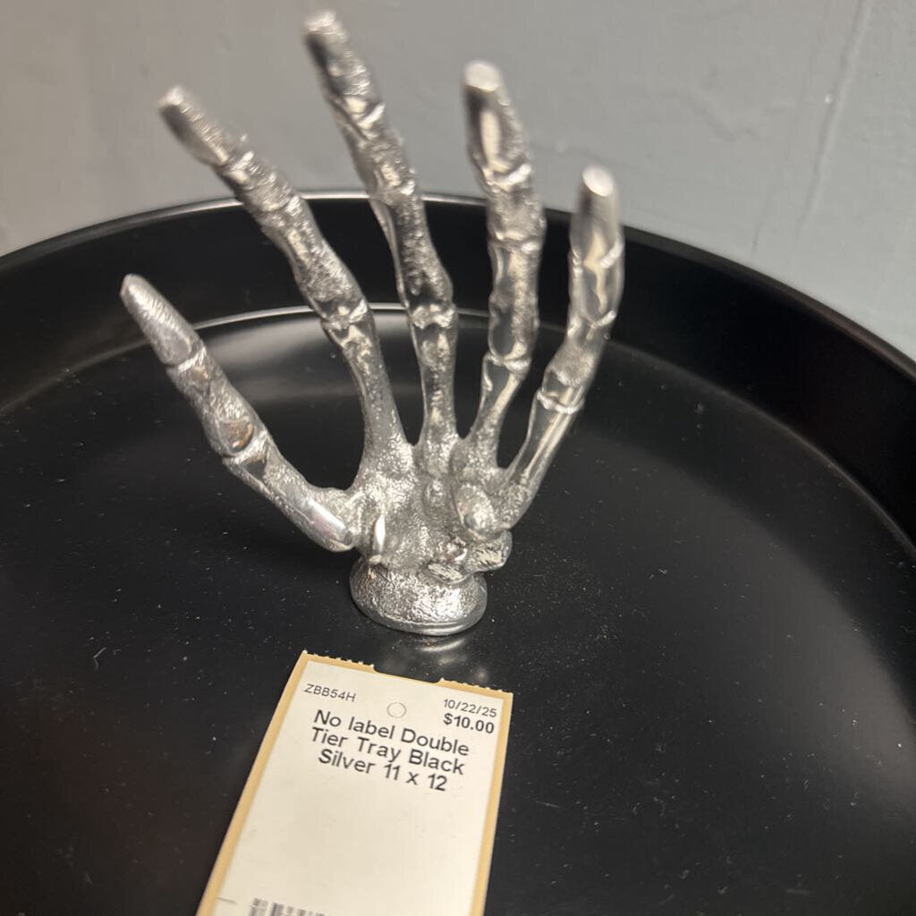 Black metal double tier Halloween inspired tray with skeleton hand handle.