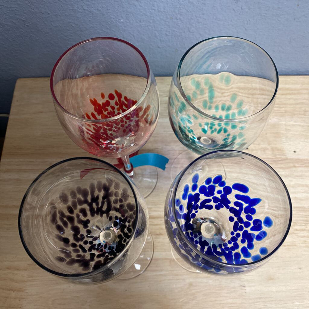 Set of four colorful stemmed wine glasses with cobalt, red, green, and purple accents.