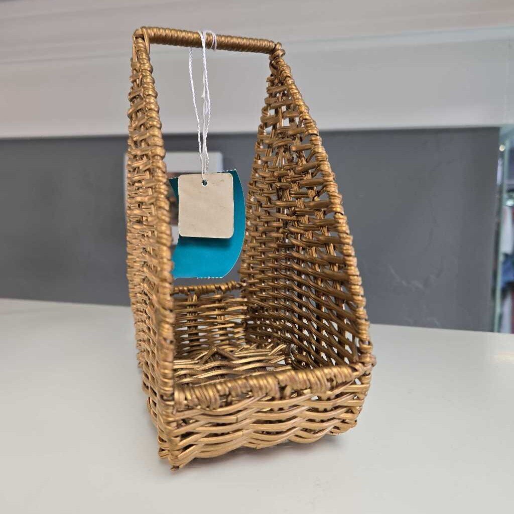 Gold tone upside down heart shaped wicker napkin holder.