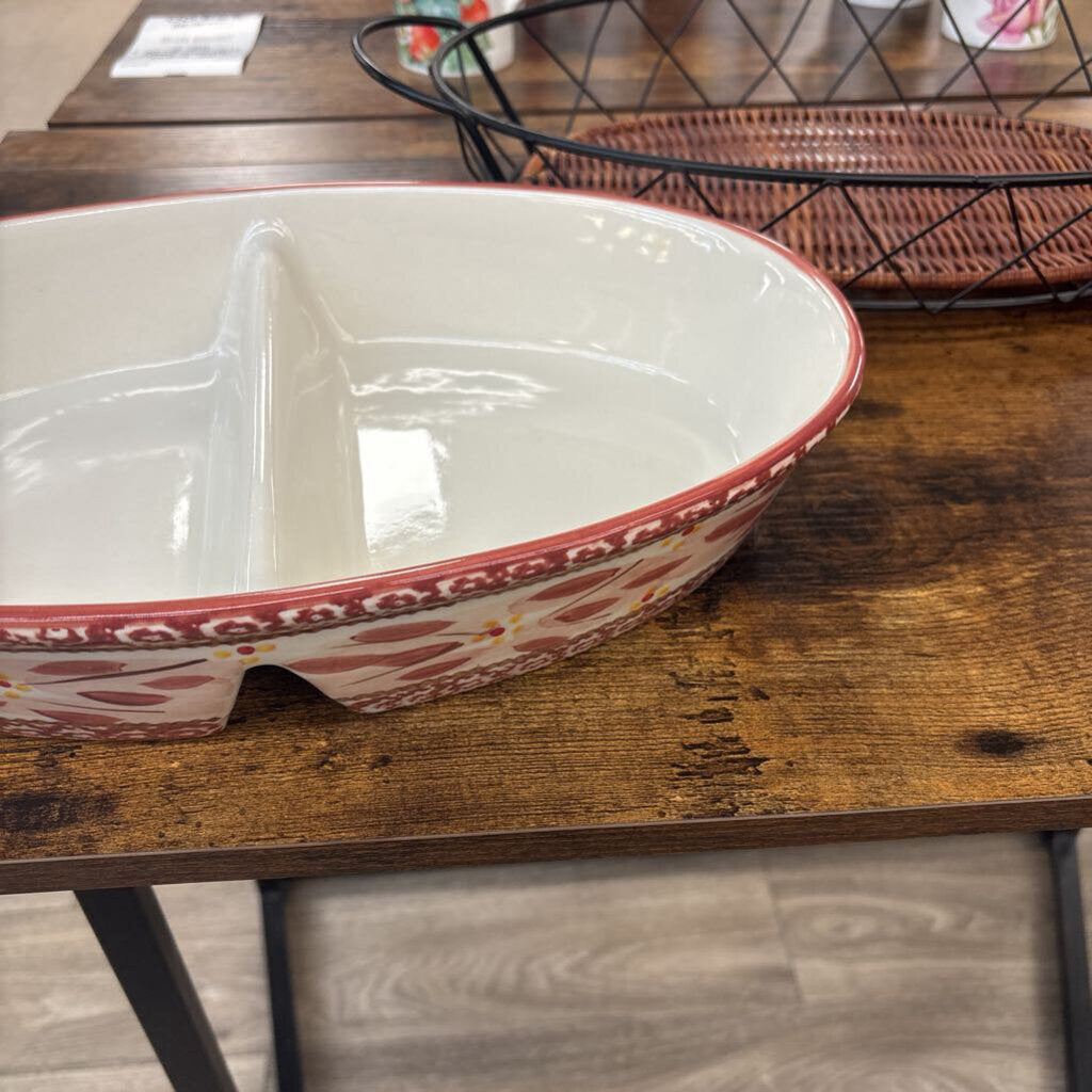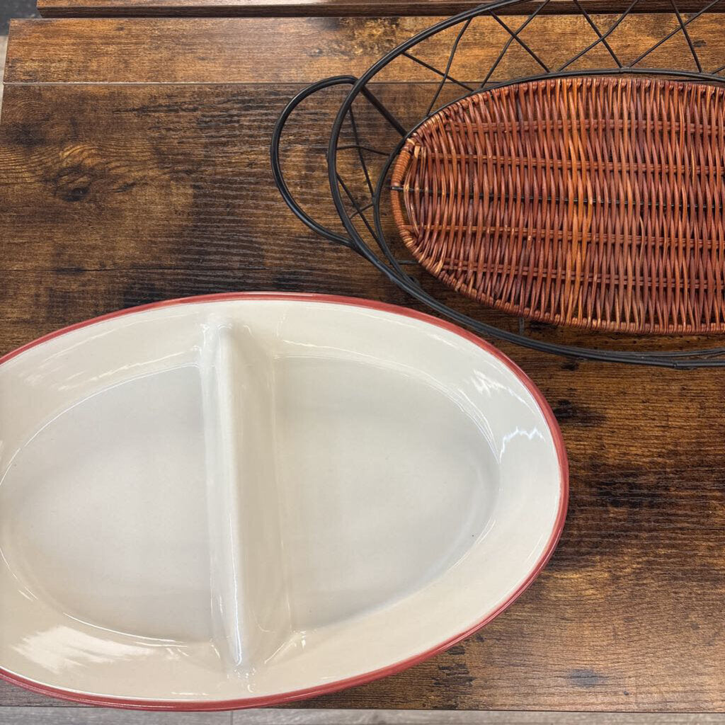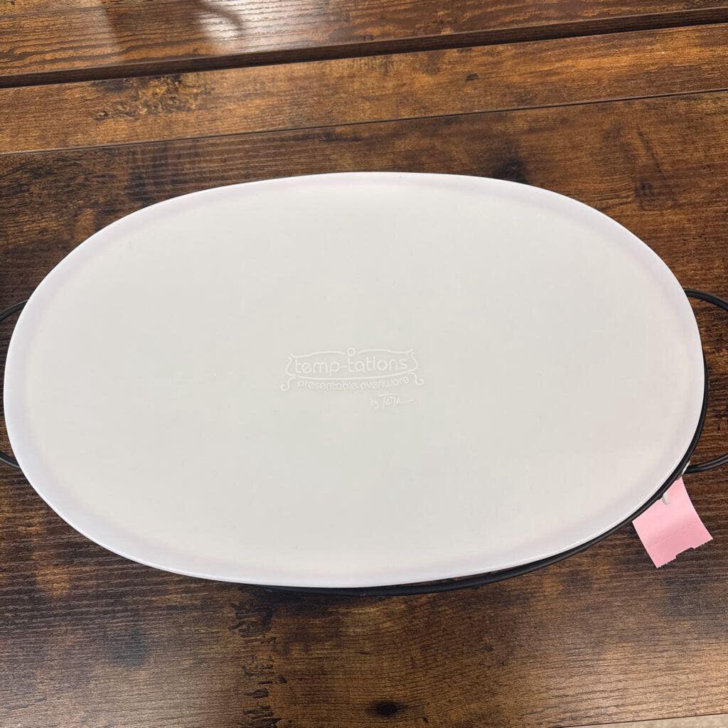 Old world oval baker with a metal wire serving rack and lid, three piece set.