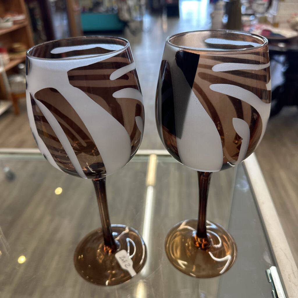 two wine glasses; 9" tall ; each frosted like animal stripes