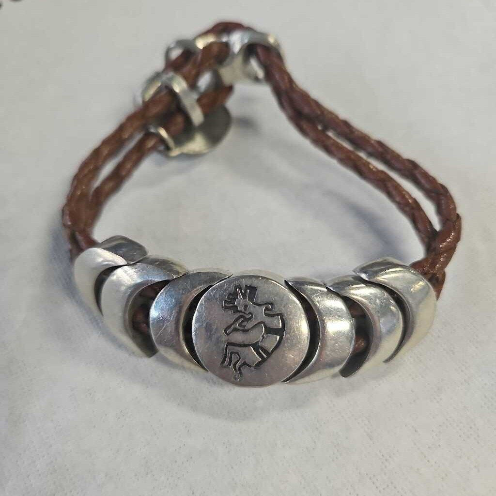 Brown braided leather bracelet with silver tone links with Kokopelli symbol. Marked USA inside and 7.
