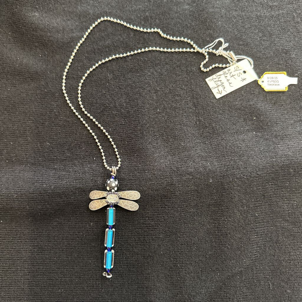 Stainless steel ball chain with art glass dragonfly pendant signed De Long.