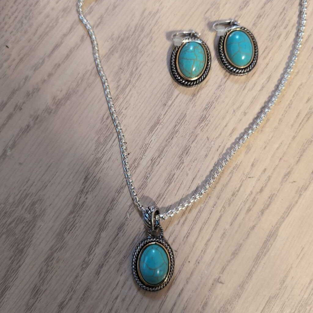 n/a Necklace & Earring Set 20" Chain 1" Drop Earrings Silvertone w/Turquoise Color Stone