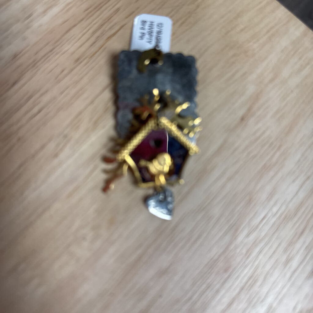 Multi layer bird house brooch pin in silver and gold tone, features a crescent moon and heart.